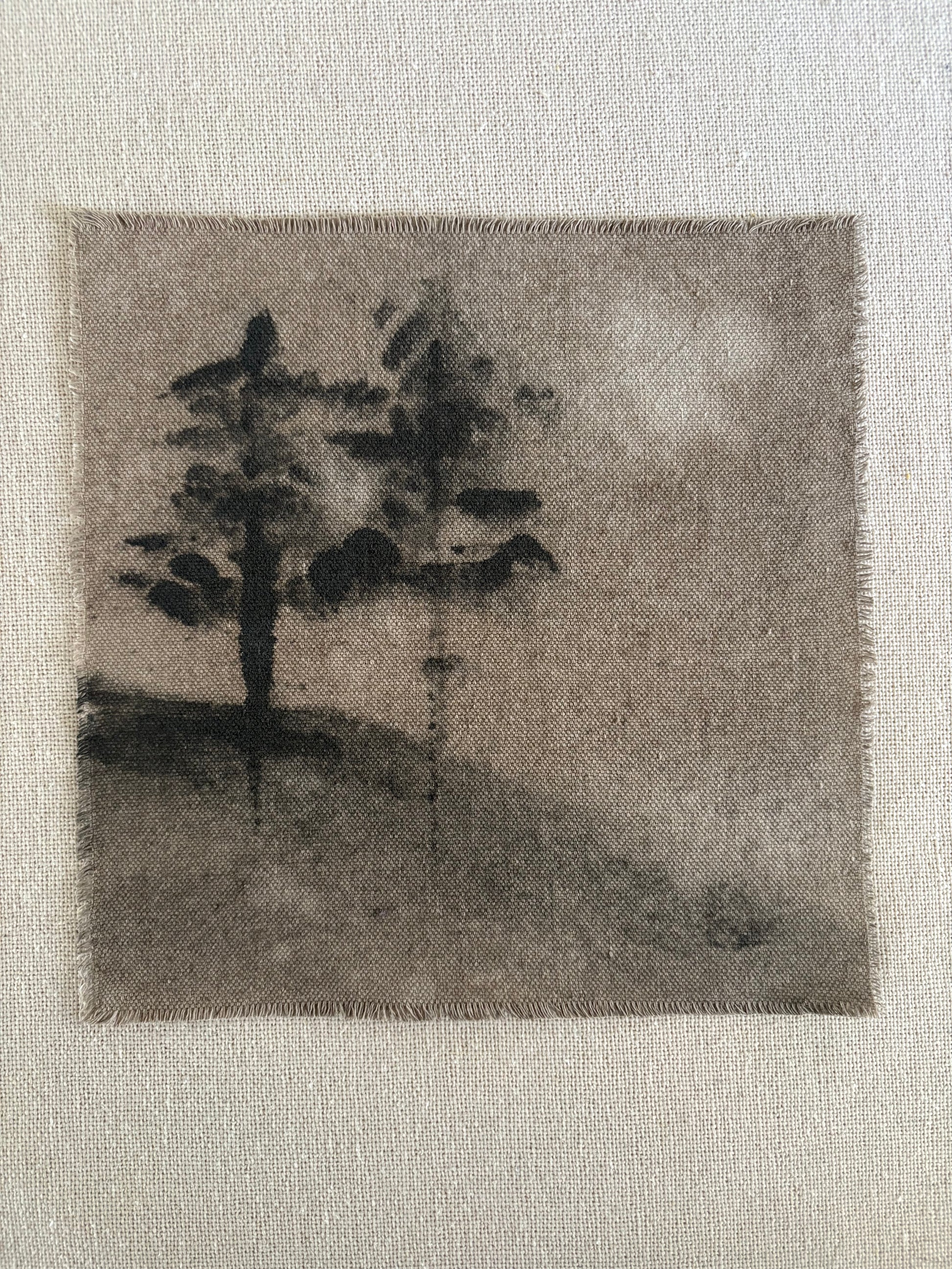 Water-based abstract landscapes on raw canvas fragments. Created from scrap canvas used in other bodies of work. There is an option to purchase framed or unframed. The framed options comes in a thin black metal frame with a glass covering & canvas set against a white backing